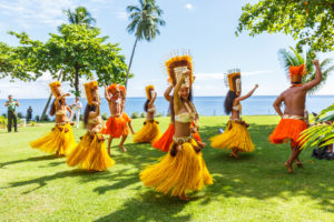 Polynesian women perform traditional dance in Tahiti Papeete, French Polynesia. Polynesian dances are major tourist attraction of luxury resorts of French Polynesia