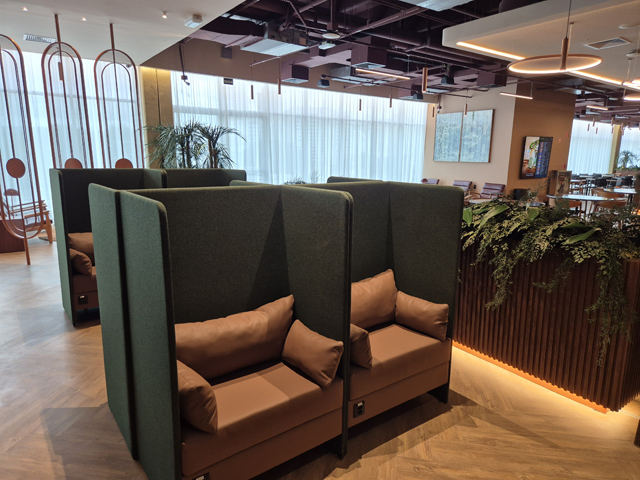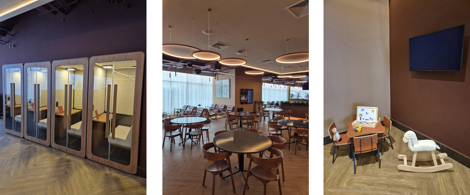 O lounge reúne cabines privativas, mesa de coworking, estação gastronômica com menu completo e um espaço kids que garante conforto para quem viaja em família. Fotos: divulgação