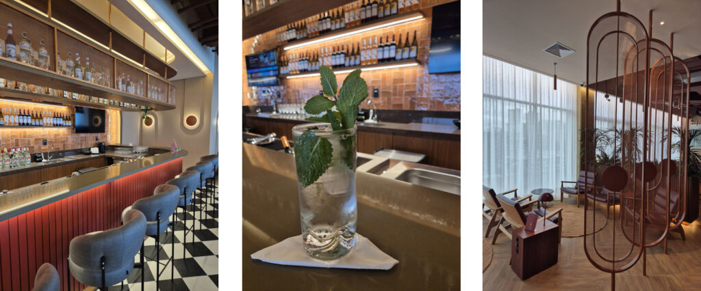 O lounge oferece uma experiência completa para diferentes perfis de viajantes. Entre as áreas, há cabines privativas para reuniões, mesa de coworking, espaço kids e uma estação gastronômica com menu variado que atende todas as refeições do dia. Os drinks são preparados por bartenders especializados, em um bar que se destaca pelo piso quadriculado no estilo Art Déco, referência direta à arquitetura original do Aeroporto de Congonhas.