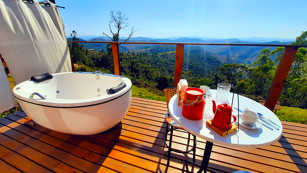 As acomodações têm vista panorâmica para as montanhas a partir do espaçoso deck de madeira, onde também está instalada uma banheira de hidromassagem, ao ar livre, que oferece uma vista espetacular, enquanto o hóspede relaxa nas águas quentinhas do equipamento. Em noites estreladas, use a luneta disponível na habitação para contemplar o céu.