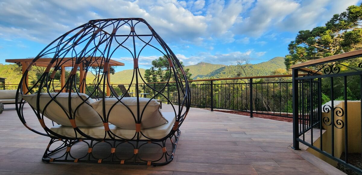 Entre as opções de hospedagem, destaca-se o Chalé Master, que combina charme e exclusividade, incluindo garagem privativa e varanda com vista para as montanhas.