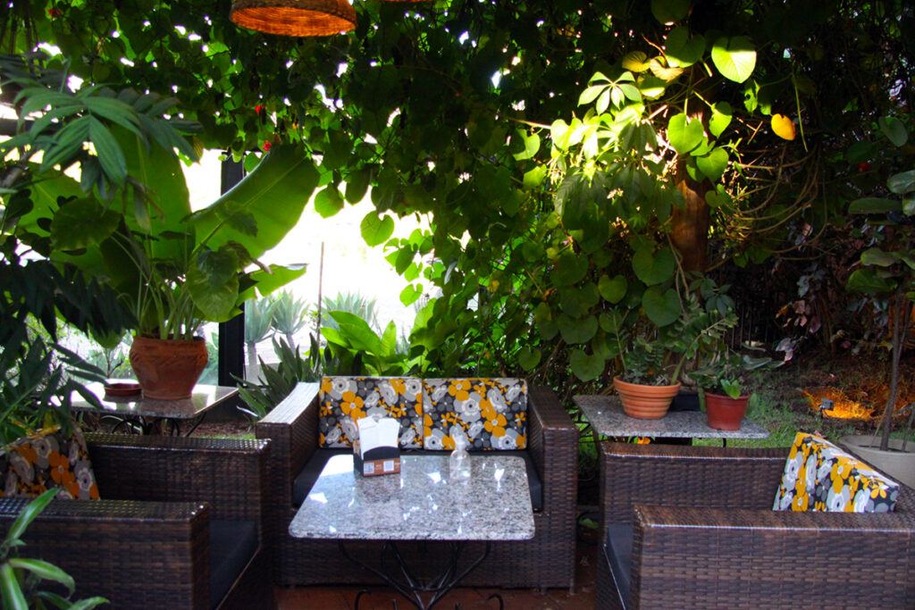 A área externa da badalada cafeteria é cercada por muito verde, com árvores e flores nativas da Mata Atlântica. O lugar faz lembrar algumas cafeterias francesas e italianas, que disponibilizam as mesas em meio aos jardins floridos, criando uma atmosfera em sintonia com o meio ambiente. No Shopp Café, as mesinhas ficam embaixo de árvores frondosas ou em pequenos bangalôs, com sofás confortáveis.